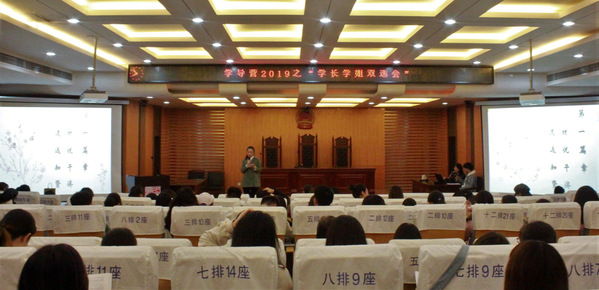 活动划分为三个篇章,“材优干济,道远知贤”、“守正实践,追求卓越”、“立志笃学,意在鸿鹄”。篇章伊始,两位辅导员及上一届优秀学导代表对本届学长进行推荐。在“立志笃学,意在鸿鹄”篇中,18级优秀学生代表郭小凡从大学学习的四个基本性质出发,重点强调了课前的预习工作、课中对课堂风格的把握以及课后及时的巩固反馈之重要性,阐述了“课程学习与学术科研是一对辩证关系,鼓励新生锻炼自己的学科思维。在“材优干济,道远知贤”篇中,17级优秀学生代表吴晓丹围绕“新兴趣“和”专业契合点“两个方向讲述了自己过去两年的学生工作经历,给在场新生分享了自己完成任务以及处理关系的经验,同时强调了“学业与学生工作应该兼顾”。在“守正实践,追求卓越”篇中2018-2019学年度校长特别嘉奖方圆奖得主、17级优秀学生代表顾宗文结合自身普法和实习的经历向在场新生鞭辟入里地讲述了如何衔接理论学习和实践以及何为实践的重要性,迎来场下阵阵掌声。