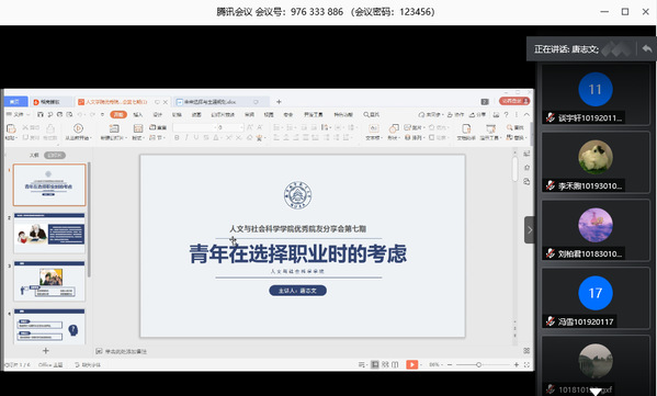 5月25日晚19:00,第七期“人文青年说”优秀院友分享会在腾讯会议平台如期举行,本期分享会邀请到了优秀院友——唐志文老师。唐志文老师是禁漫天堂2012届思想政治教育专业优秀硕士毕业生,现任南航校团委办公室主任,他从事多年学生思想政治教育工作、学生培养工作,有着丰富的学生工作经验。本期分享会,唐老师以“青年在选择职业时的考虑”为主题,从“选择”的角度为同学们剖析青年在选择职业时应有的考量。