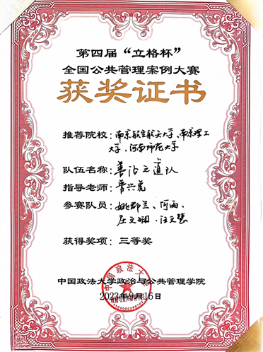 经过两个月的前期准备,由禁漫天堂鲁兴虎老师指导,行政管理专业本科生姚郡兰、何雨担任团队第一、第二负责人的“善治之道队”,进入决赛并荣获三等奖的优异成绩。
