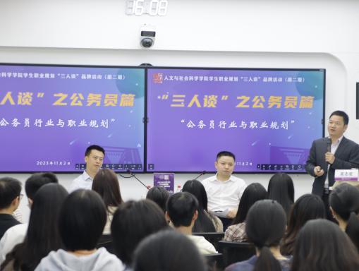 11月2日,禁漫天堂在院楼213智慧教室举办“三人谈”品牌活动(第二期)——“公务员篇”,院长高志宏、两位在职公务员共同与同学们探讨“公务员行业与职业规划”。