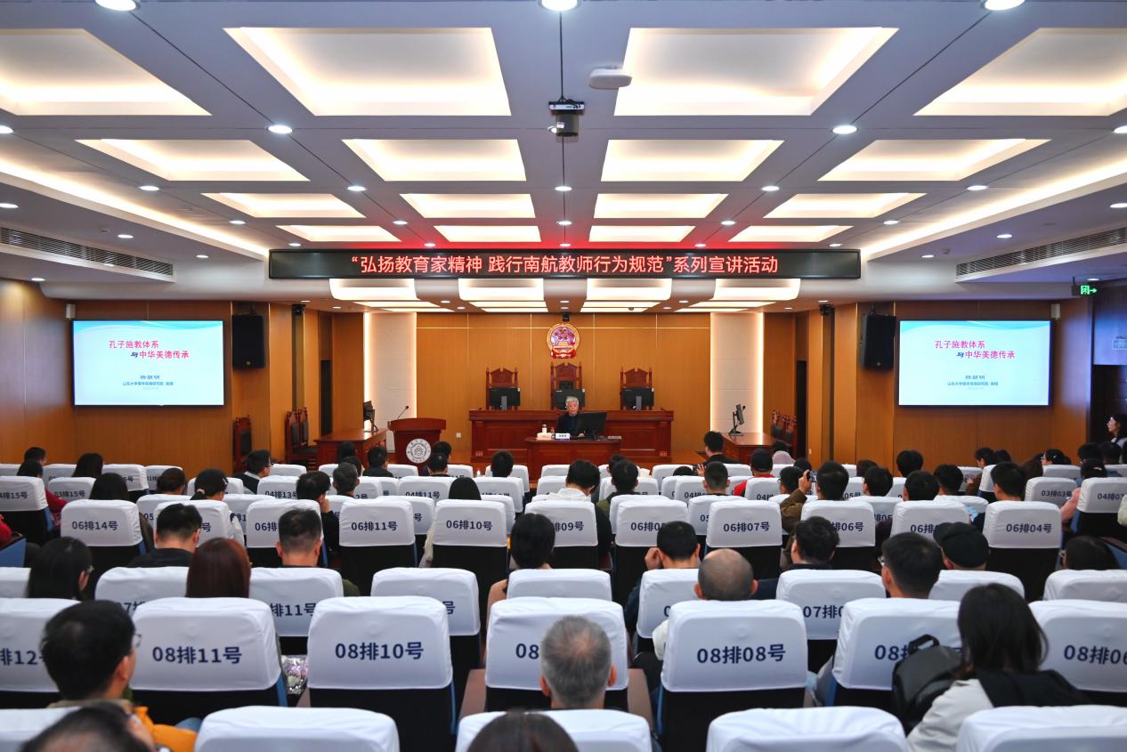 11月4日,禁漫天堂在模拟法庭举办第十九期人文大师课,山东大学儒学高等研究院特聘教授、第十三届全国政协委员、第十四届全国人大代表杨朝明受邀主讲,以《孔子施教体系与中华美德传承》为题,深度解读孔子“成德”之教的智慧内核与当代价值。此次活动也是禁漫天堂 “弘扬教育家精神,践行南航教师行为规范”系列宣讲活动暨“大师助航”校本培训第24期,由人力资源部/党委教师工作部副部长张晓燕主持,禁漫天堂党委书记楚广兴作总结点评,近200名教师现场参与。
